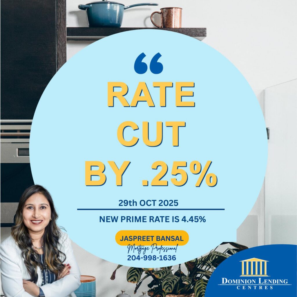 The Bank of Canada has just reduced its policy rate by 0.25%, which means the prime rate will drop from 4.70% to 4.45%.